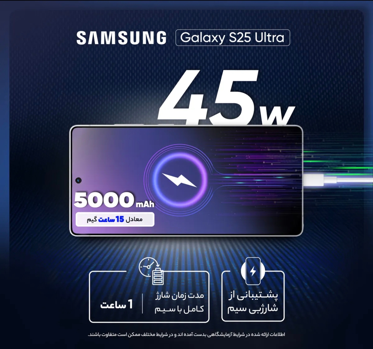 شارژدهی و ویژگیها Samsung Galaxy S25 Ultra به یک باتری بزرگ 5000 میلیآمپر ساعتی مجهز است که به راحتی میتواند یک روز کامل استفاده از گوشی را پوشش دهد. این گوشی از شارژ سریع 45 وات پشتیبانی میکند که به گفته سامسونگ، در 30 دقیقه میتوان تا 65 درصد از ظرفیت باتری را شارژ کرد. همچنین، پشتیبانی از 25 وات شارژ بیسیم (Qi2) و 4.5 وات شارژ معکوس نیز امکان شارژ سایر دستگاهها را از طریق گوشی فراهم میآورد. گوشی S25 Ultra با سیستمعامل Android 15 و One UI 7 عرضه میشود که قابلیتهای متنوع و طراحی کاربرپسند دارد. طبق گفته شرکت سامسونگ، این دستگاه به روزرسانیهای نرمافزاری را به مدت 7 سال دریافت خواهد کرد که نشان از پشتیبانی طولانیمدت سامسونگ دارد. Samsung DeX و Wireless DeX امکان تبدیل گوشی به یک تجربه دسکتاپ را فراهم میکنند. همچنین، ویژگیهایی مانند NFC، Ultra Wideband (UWB) و پشتیبانی از 5G، این دستگاه را به یک انتخاب عالی برای کاربران حرفهای تبدیل میکنند.