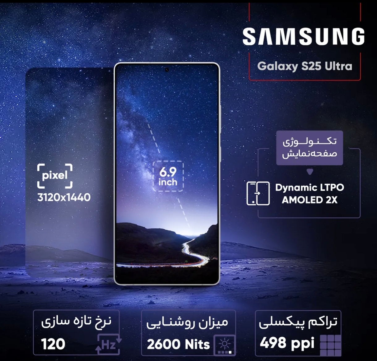 Samsung Galaxy S25 Ultra از طراحی شیک و مدرن برخوردار است که با استفاده از مواد بسیار مقاوم ساخته شده است. این گوشی ضخامت 8.2 میلیمتری و وزن 218 گرمی دارد. در این گوشی خبری از لبههای تیز S24 Ultra نیست و لبههای خمیده و کاهش وزن 15 گرمی، این گوشی را خوشدستتر کرده است این گوشی با استفاده از گوریلا گلس آرمور 2 در جلوی دستگاه و پشت آن و همچنین فریم تیتانیوم درجه 5، استحکام بسیار بالایی دارد. همچنین، استاندارد IP68 برای مقاومت در برابر آب و گرد و غبار تا عمق 1.5 متر به مدت 30 دقیقه، به آن امکان میدهد که در شرایط مختلف محیطی نیز بدون نگرانی از آسیب دیدن، از آن استفاده کنیدنآببببب. این ویژگیها باعث شده است تا S25 Ultra علاوه بر داشتن طراحی جذاب، در برابر آسیبها نیز مقاوم باشد. نمایشگر Dynamic LTPO AMOLED 2X با سایز 6.9 اینچ و وضوح 1440 در 3120 پیکسل یکی از نقاط قوت این گوشی است. این نمایشگر با تراکم پیکسلی 498 پیکسل بر اینچ، تصاویری بینظیر و واضح را به نمایش میگذارد. همچنین،HDR10+ و حداکثر روشنایی 2600 نیت، تجربهای شگفتانگیز از تماشای ویدیوها و بازیها را فراهم میکند. Samsung Galaxy S25 Ultra همچنین از نرخ تازهسازی 120 هرتز پشتیبانی میکند که باعث میشود تجربه اسکرول و تعامل با دستگاه فوقالعاده روان و سریع باشد. به علاوه، قابلیت Always-on Display امکان مشاهده زمان و اطلاعیهها را بدون نیاز به روشن کردن کامل صفحه فراهم میکند.دوربین ها