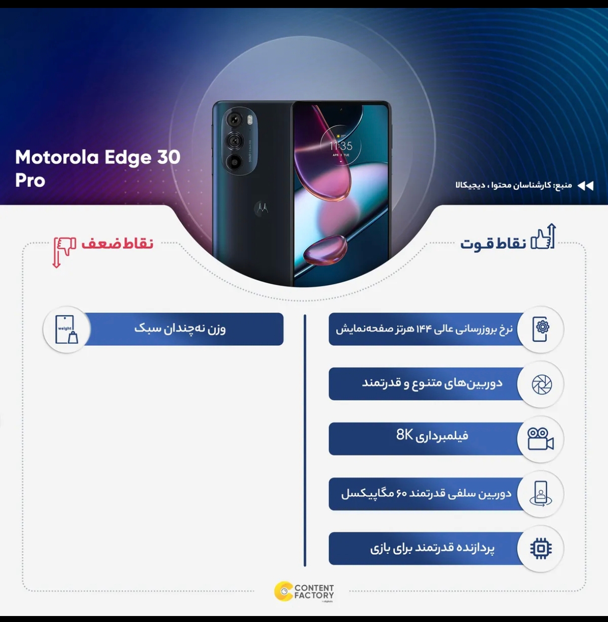 یکی از مواردی که موتورولا در سری Edge بسیار بهآن توجه کرده است، نرخ بروزرسانی بالایی است که برای صفحاتنمایش این گوشیهای هوشمند در نظر گرفته. موتورولا Edge 30 Pro هم از این اتفاق مستثنی نیست و به صفحهنمایشی با نرخ بروزرسانی ۱۴۴ هرتز مجهز شده است. چنین نرخ بروزرسانی بالایی را در گوشیهای هوشمند گیمینگ دیده بودیم که نشان از آن دارد که این گوشی، توانایی ارائه عملکرد بسیار خوبی در اجرای بازی بدون لگ را دارد. البته لازم به ذکر است که سوای صفحهنمایشی روان و بدون لگ، این صفحهنمایش به نسبت صفحاتنمایش با نرخ بروزرسانی ۱۲۰ هرتز، در اجرای ویدیوهای باکیفیت هم عملکرد بهتری دارد.صفحهنمایش ۶.۷ اینچ با رزولوشن ۱۰۸۰×۲۴۰۰ پیکسل از نوع اولد که توانایی نمایش ۳۹۳ پیکسل در هر اینچ را دارد. انتخاب پنل اولد و میزان رزولوشن در نظر گرفته شده، بسیار انتخاب درست و بهجایی بود، اما شاید بهتر بود میزان PPI بالاتری برای صفحهنمایش در نظر گرفته میشد (بهتر بود توانایی نمایش بیشتر از ۴۰۰ پیکسل را در هر اینچ داشت). اما با تمام این تفاسیر، باید بگوییم که در شرایط نوری متنوع عملکرد بسیار خوب و قابل قبولی را از این صفحهنمایش شاهد خواهید بود و بدون هیچ تعریف اضافی، بدون شک چنین صفحهنمایشی لیاقت همراهی یک گوشی هوشمند پرچمدار را دارد.